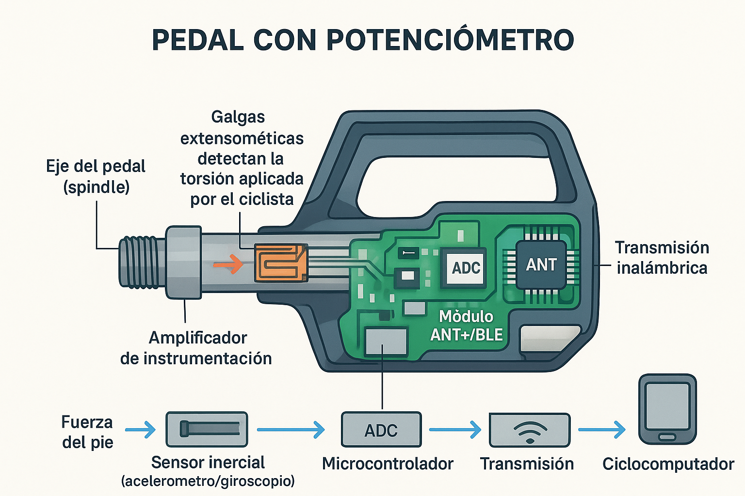 Dentro del pedal se integran galgas extensométricas (strain gauges), que son pequeños sensores adheridos al metal del eje del pedal.